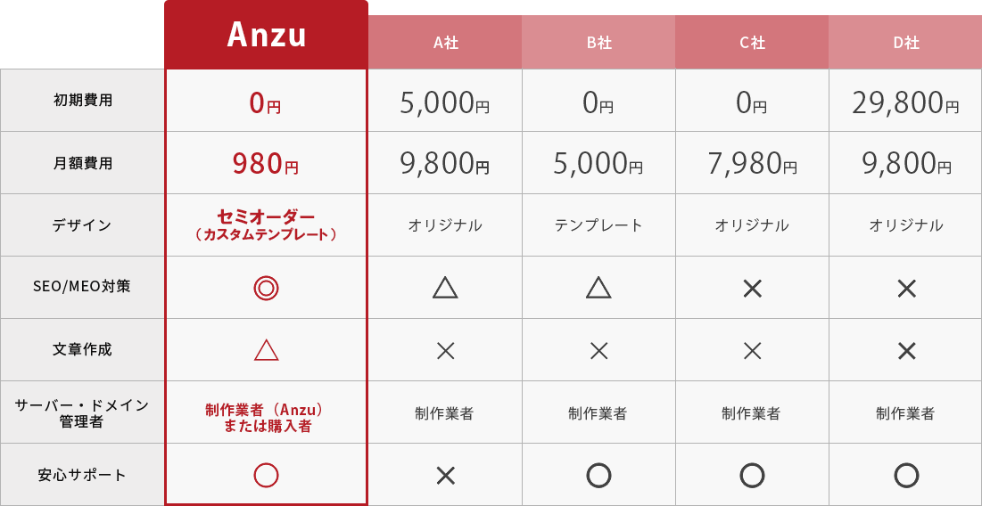 そんな他社のサービス(一部)とAnzuのサービス内容を比較してみました。