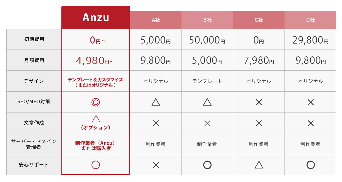 個人事業主や中小企業にとって、高額な制作費や毎月の支払いは大きな負担になります。Anzuではそういう方にこそ気軽に利用していただきたいという想いで品質を保ちつつ、利用しやすい低価格にチャレンジしました。